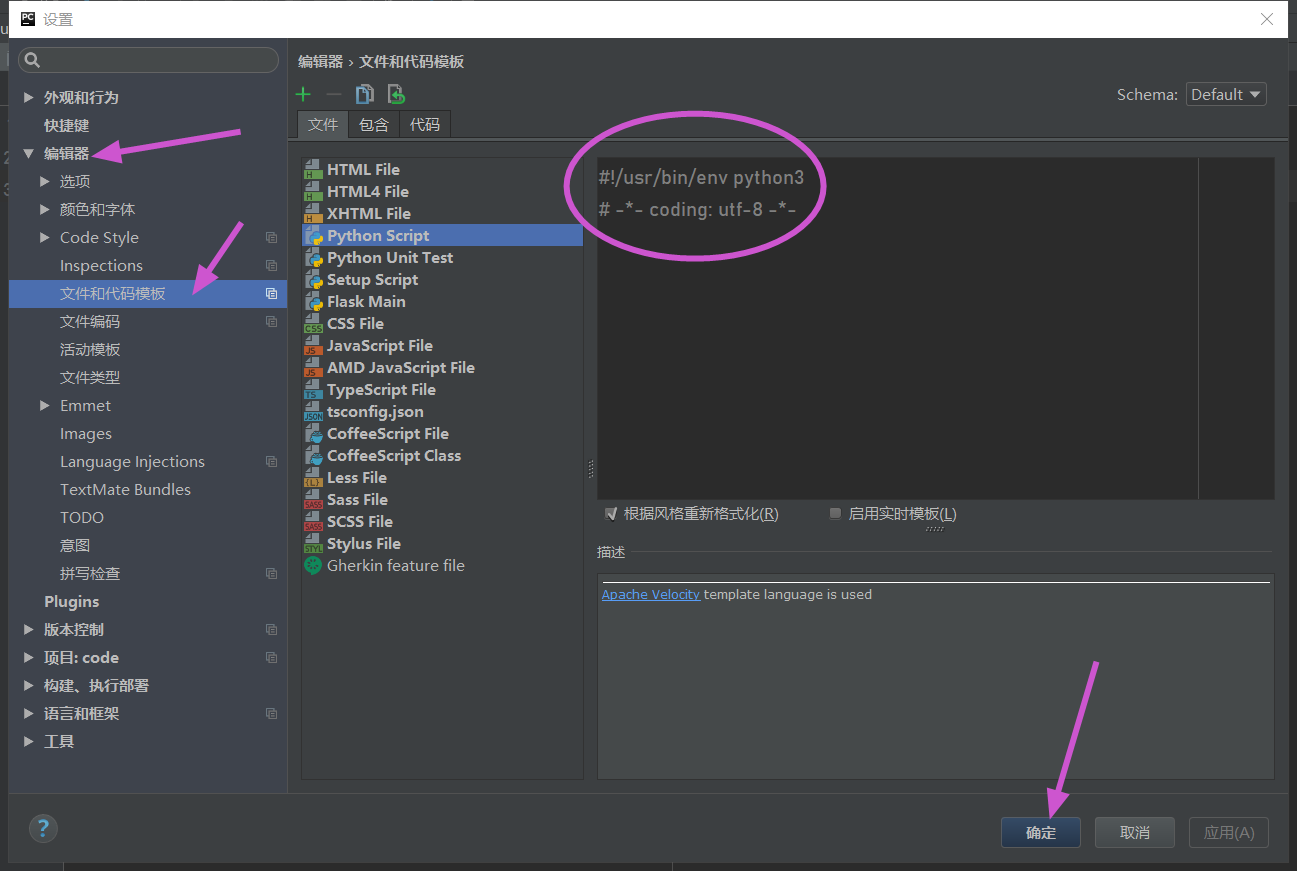 文件--设置--编辑器--文件和代码模板,然后选择Python Scripts,在右边输入上面两行代码,再点确认就可以了。以后在Pycharm中新建Python文件时就会自动加上这两行代码。
