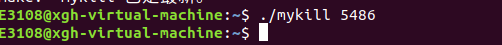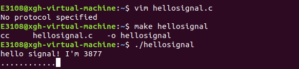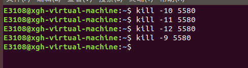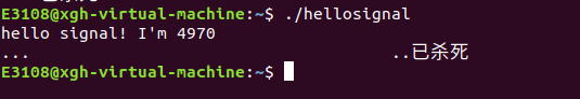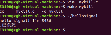 另外再开启一个终端,在终端通过输入 kill 命令来给进程发送信号,进程的 pid 在程序运行的第一 行输出,每次运行程序的时候 pid 是不同的,这个是大家要注意的。