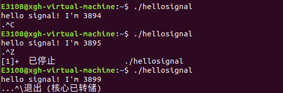 我们可以在当前终端通过按键组合向该进程发送信号 CTRL+C 、 CTRL+Z 、 CTRL+\ ,大家可以试着 在每一次运行该程序的时候分别通过按键发送不同的信号来观察进程的反应。这里三个按键组合说明要 发送三个信号,所以我们要运行该程序三次,然后每次使用不同的按键组合来观察。