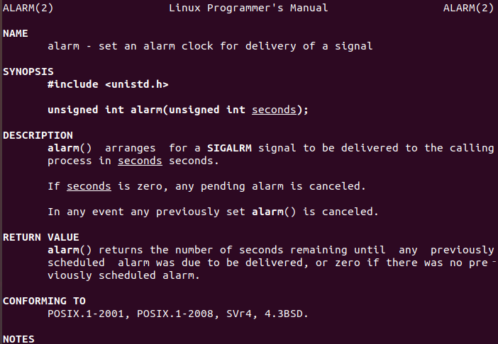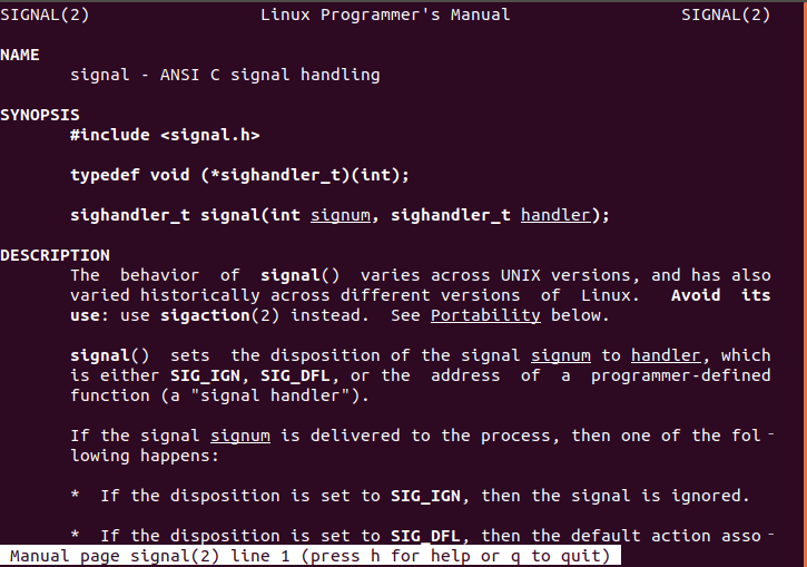 这里我们可以 通过 signal() 来改变进程对某个信号的处置方式。 signal() 可能是很多同学目前为止 见过最复杂的函数。我们通过查看手册: man 2 signal