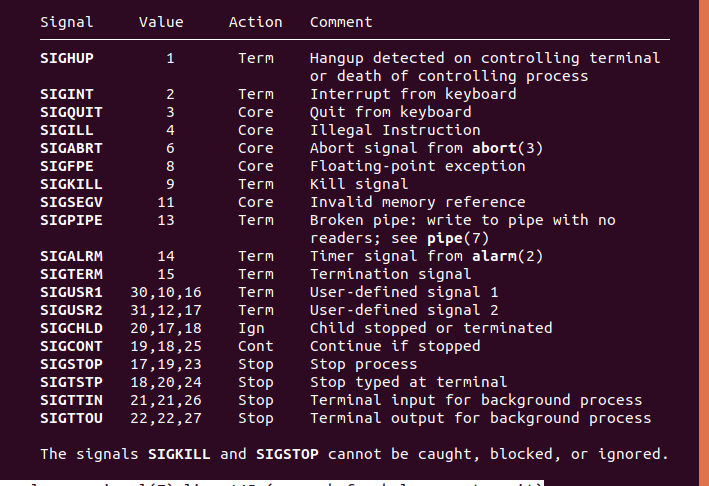这里我们通过命令 man 7 signal 可以查看当前系统信号的清单: