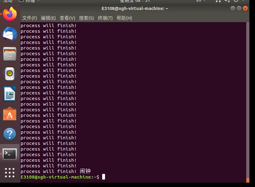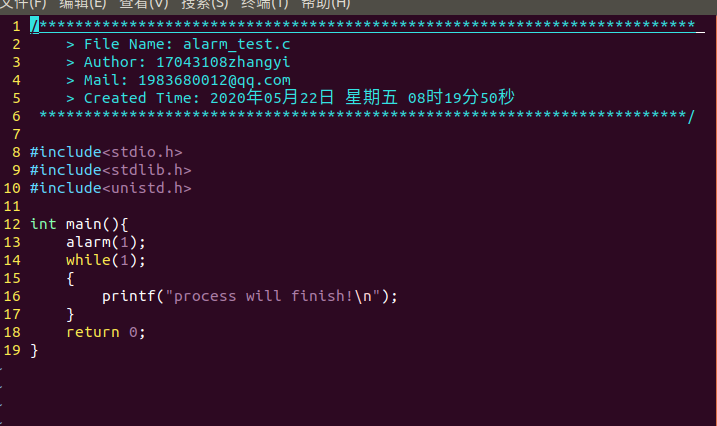 虽然程序中有无限循环,不断输出字符串 process will finish! ,由于调用了 alarm(1) 函数, alarm 函数会在1秒后给该进程发送 SIGALRM 信号,然后进程结束。