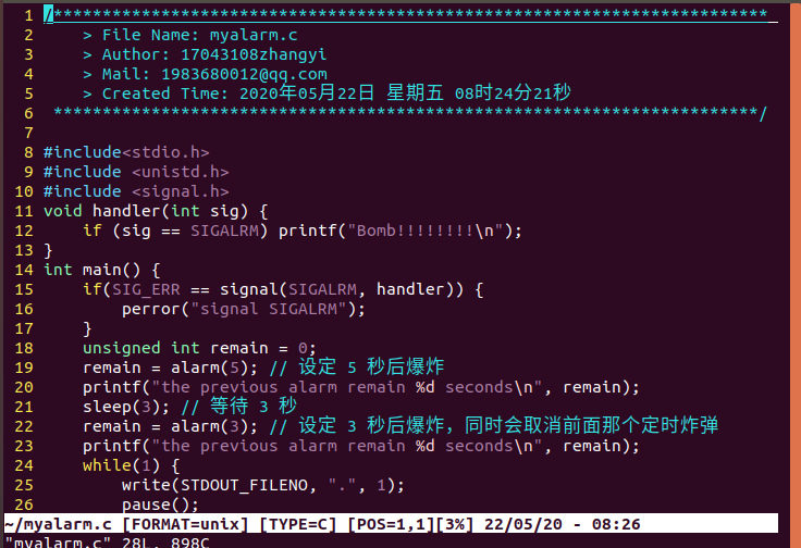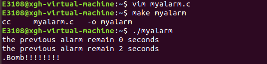 这里计时时间到了并不会结束进程,因为我们编写了信号捕捉函数,产生 SIGALRM 信号后会输出字符 串 Bomb!! , 我们可以键盘按键组合结束进程,这里我用了 CTRL+C 。