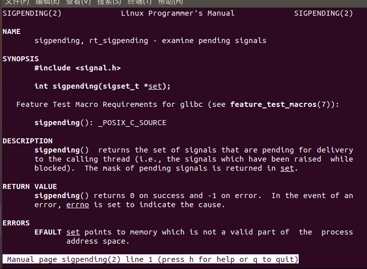 对于未决信号集我们不能直接操作,可以使用 sigpending 函数获取未决信号集。