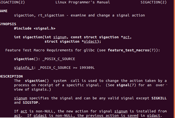 不同于 signal 函数, sigaction 函数是符合 POSIX 标准的,而 signal 只是 ANSI C 定义的函数。 除了上面的区别外, sigaction 提供了更多的功能。比如它可以处理带参数的信号,在信号处理的时 候,可以屏蔽其它信号等等。我们通过 man 2 sigaction 来查看手册: