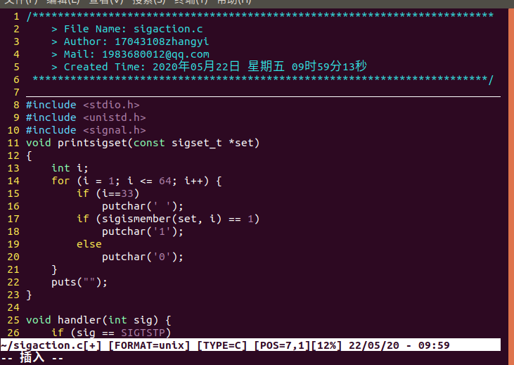 下面给出一个程序来说明 sigaction() 函数的使用,程序注册了信号 SIGINT 和 SIGTSTP . 需要注意 的一点是 sa_mask 被设置为 SIGINT ,它表示当执行信号处理函数的时候,阻塞信 SIGINT 信号。我 在 handler 函数加入了一打印未决信号的功能,以验证执行到 handler 的时候发送 SIGINT 是被阻 塞住的。