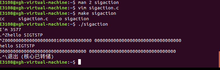 - 当程序运行的时候, Ctrl+Z 进入 handler ,然后立即 Ctrl+C 发现并不会被 SIGINT 打断,这是因 为该 handler 注册的时候被设置了 SA_MASK = SIGINT 。最后 handler 结束的时候打印了未决信号 集,发现里头有 SIGINT 。所以 handler 结束后,又去继续对 SIGINT 进行处理