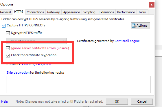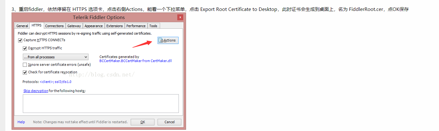 打开fiddler,点击Tools下的Options,然后点HTTPS选项卡,勾选Decrypt HTTPS traffic后,再点击Actions,信任证书(trust root certificate) 。