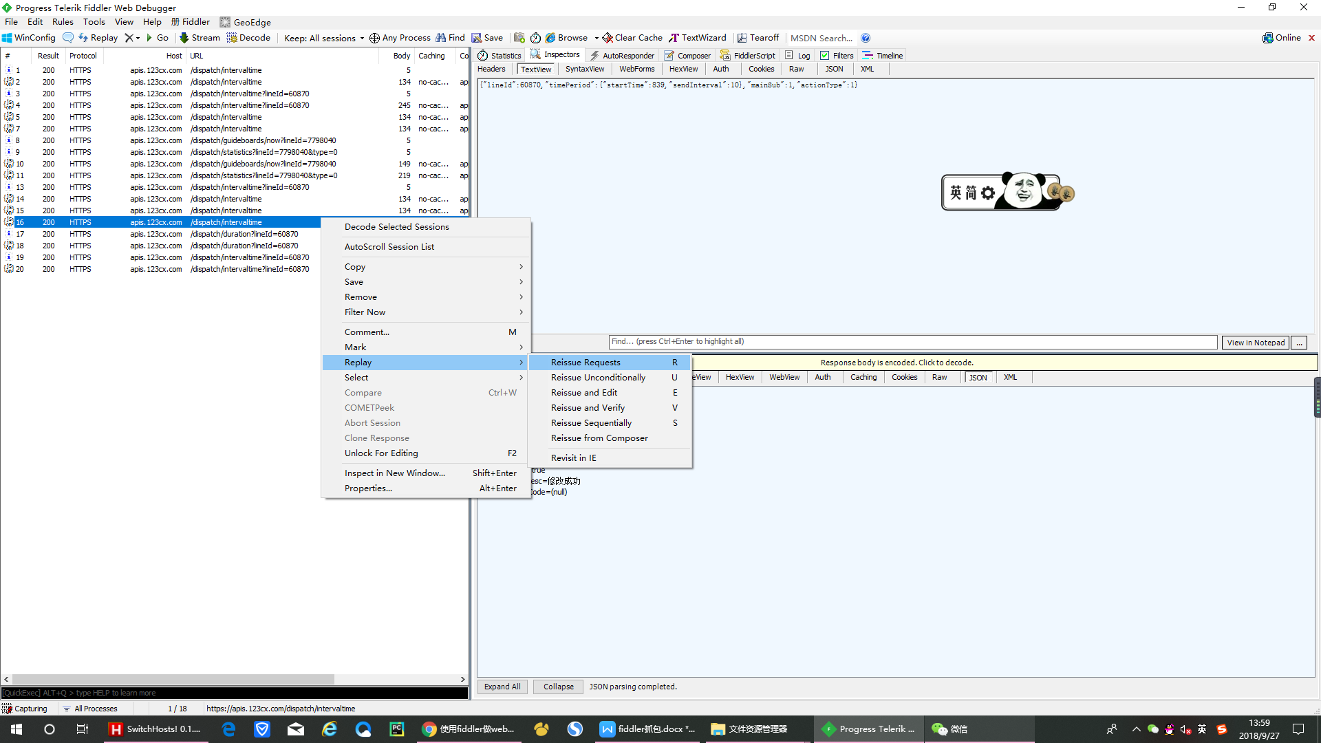 在拦截到的url上点击鼠标右键,->replay -> reissue request