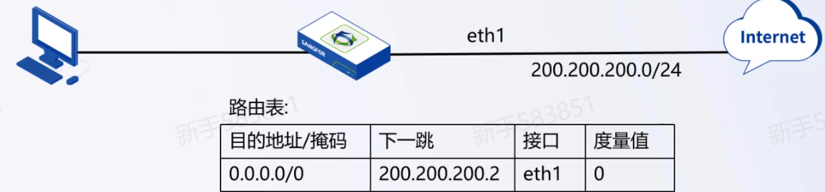 认路由可以大大简化路由器的配置,减轻网络管理员的工作负担。默认路由表示为0.0.0.0/0下一跳接口度量值