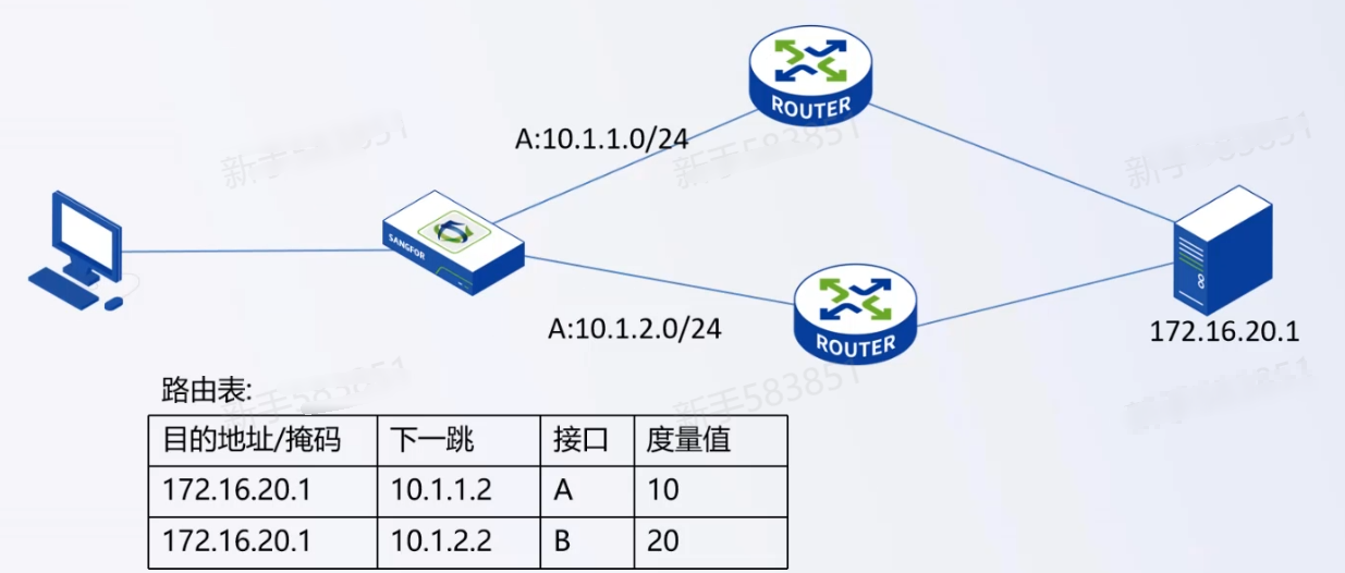 通过静态路由的度量值,设置同一目的地不同优先级的两条条静态路由,度量值越低,优先级越高,当其中某一条