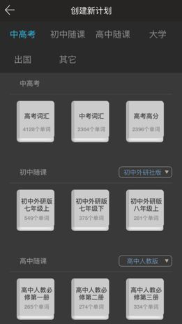 作为一款背单词软件,最基本的功能就是提供背单词的功能。在进行用户注册之后,软件便要求用户创建新计划。这些计划覆盖了中学、大学、出国等共6大类,每一大类提供了所涉及的单词书。并且针对初中和高中单词书,百词斩又提供了以不同出版社出版的教材为基础的单词书,从而满足了当前用户的最主要的需求。
