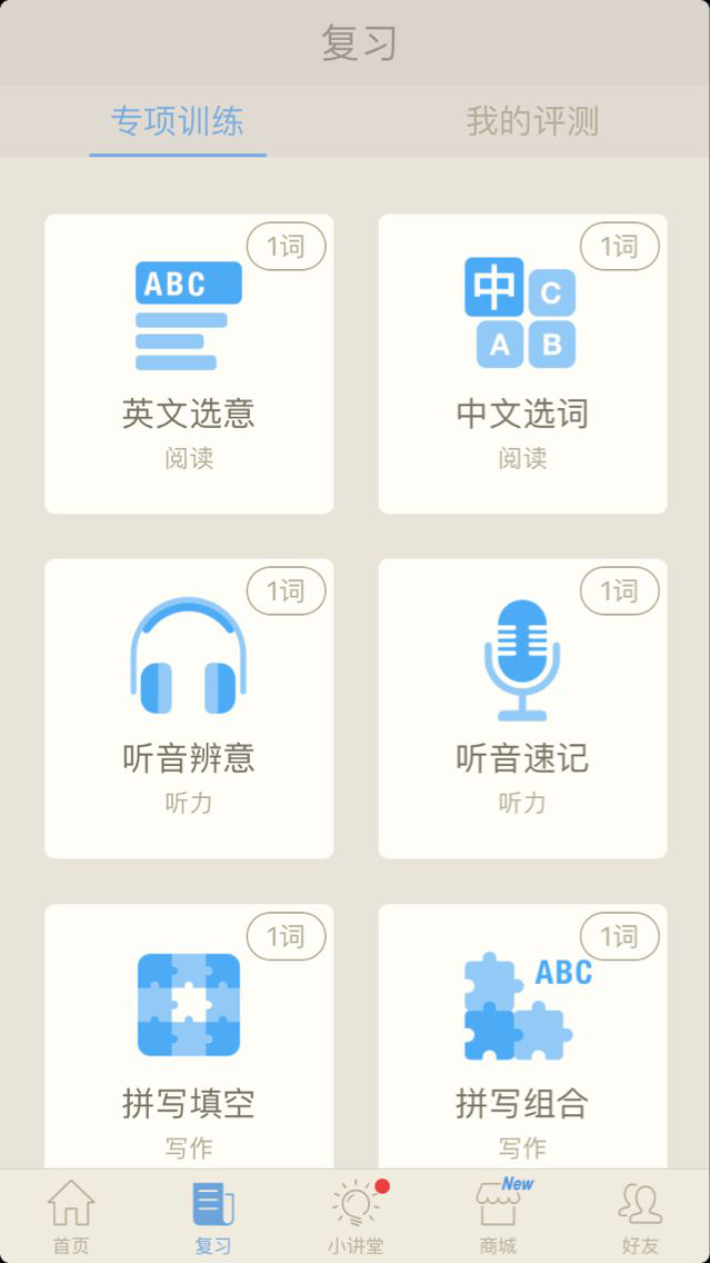 复习功能提供8种专项训练,有英文选意、中文选词、听音辨意、听音速记、拼写填空、拼写组合、自检和读句填空。这八种训练涵盖了所有的复习方式,让用户能根据自身情况选择合适的方法。