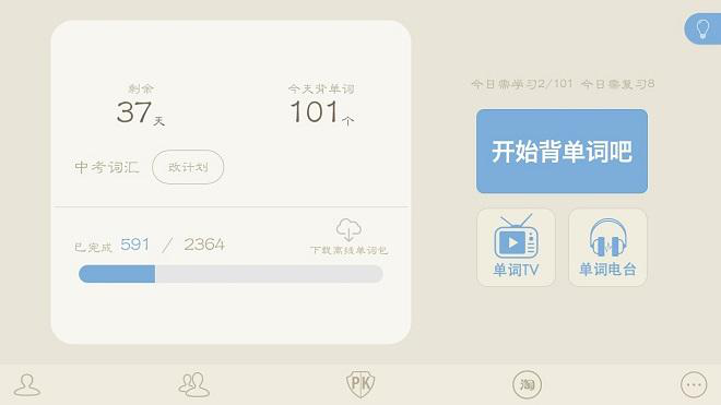 在选择完计划以后,即可在软件的首页开始自己的计划。在首页有“开始背单词吧”、“单词TV”、“单词电台”三种背单词方法,分别为传统背单词方法,看视频背单词及听音频背单词。