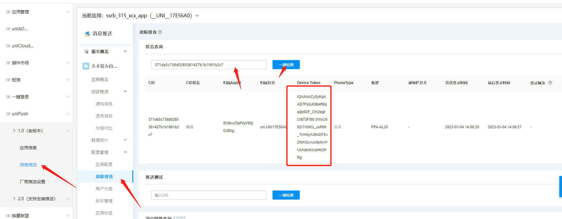 8.测试,在故障排查中输入cid,能够获取到DeviceToken,则配置成功!