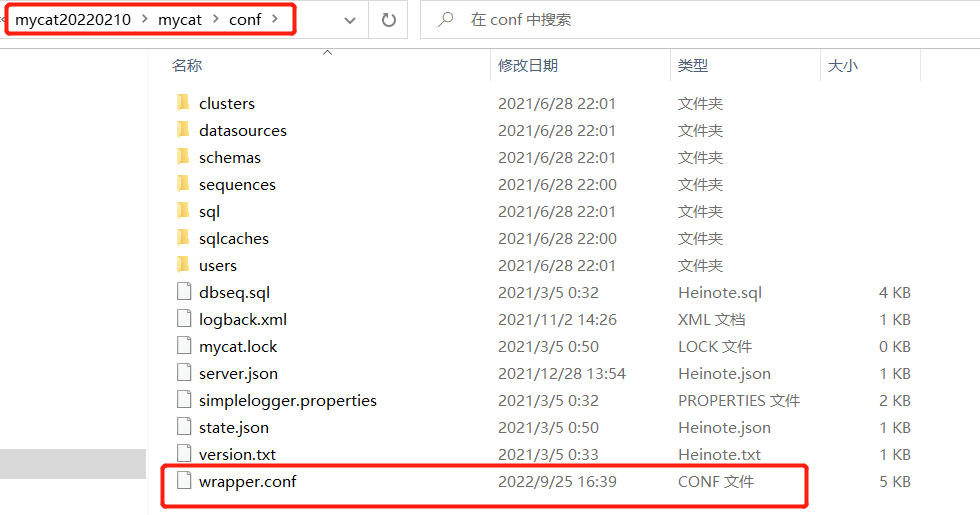 (3)配置jvm运行环境。在mycat文件夹下,找到conf文件夹,打开wrapper.conf文件