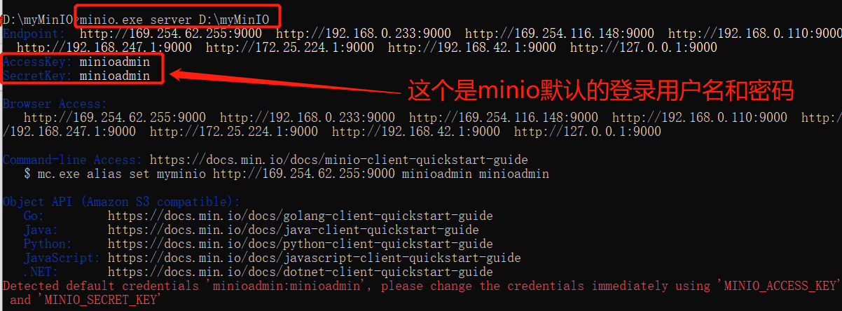 (2)第二步:输入以下命令 minio.exe server D:\myMinIO