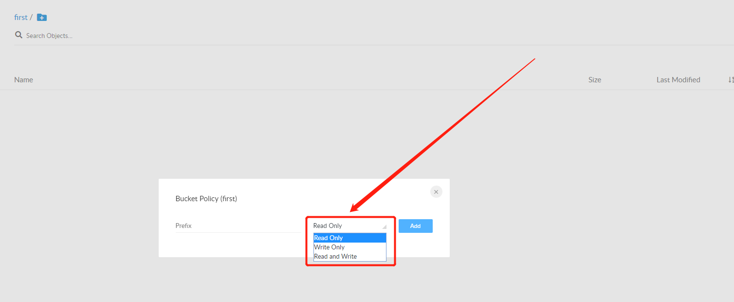 要想获取一个永久的访问路径,需要修改存储桶的访问策略,点击存储桶右上角的编辑策略按钮来修改访问策略,有三种访问策略可以选择:只读、只写、可读可写,这里我们选择只读即可,但是需要注意的是,访问前缀需要设置为*.*,否则会无法访问;