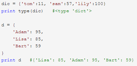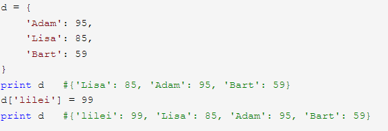 (6)可以简单地使用 d[key] 的形式来查找对应的 value,这和 list 很像,不同之处是,list 必须使用索引返回对应的元素,而dict使用key: