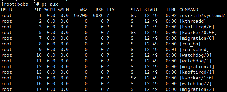 STAT:该进程的状态(D:不可中断的休眠状态 R:正在运行状态 S:处于休眠状态,可被唤醒 T:停止状态,可能是后台暂停或进程处于跟踪调试状态 Z:僵尸进程,进程已经中止,但是部分还在内存当中)