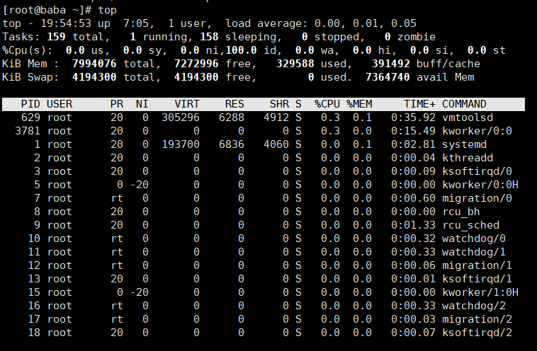 load average:0.00,0.01,0.05 系统负载,即单位时间内系统处理任务数,后面三个数值分别为1分钟、5分钟、15分钟前到现在的平均值