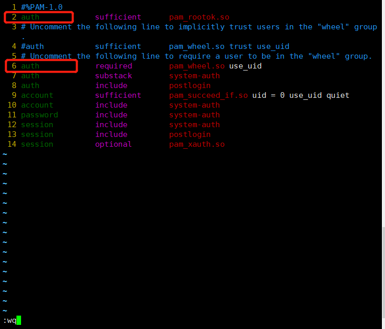 4、如果注释第二行,开启第六行,表示只有wheel组内的用户才能使用su命令,root用户也被禁止su命令