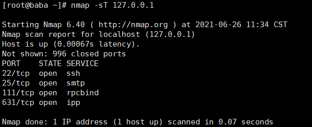 | -sT | TCP连接扫描,这是完整的TCP扫描方式(默认扫描类型),用来建立一个TCP连接,如果成功则认为目标端口正在监听服务,否则认为目标端口并未开放 |