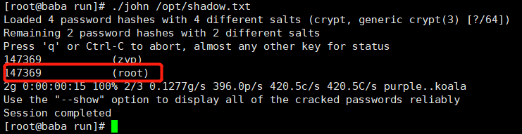 可以看到字典中没有root密码(因为破译密码都是读字典,字典中没有),所以破译不出来