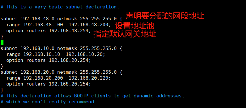 ##subnet网段声明(作用于整个子网段,部分配置参数优先级高于全局配置参数)