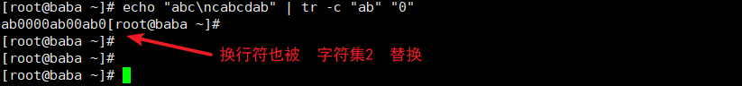| -c | 保留字符集1的字符,其他的字符(包括换行符\n)用字符集2替换 |