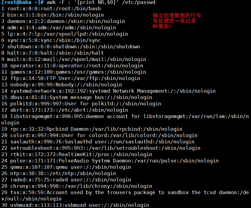 | RS | 行分割符,awk从文件上读取资料时,将根据RS的定义把资料切割成许多条记录,而awk一次仅读入一条记录,以进行处理。预设值是‘\n’ |