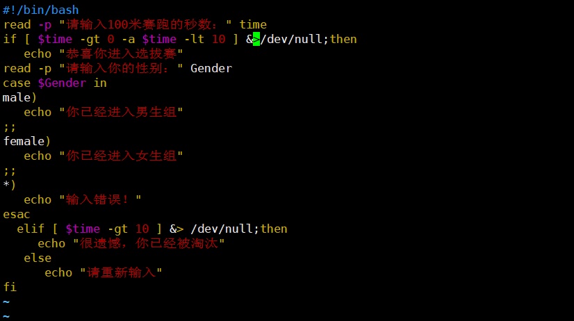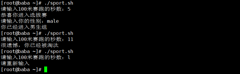 1.提示用户输入100米赛跑的秒数,要求判断秒数大于0且小于等于10秒的进入选拔赛,大于10秒的都淘汰,如果输入其它字符则提示重新输入;进入选拔赛的成员再进一步判断男女性别,男生进男生组,女生进女生组,如果输入错误请提示错误