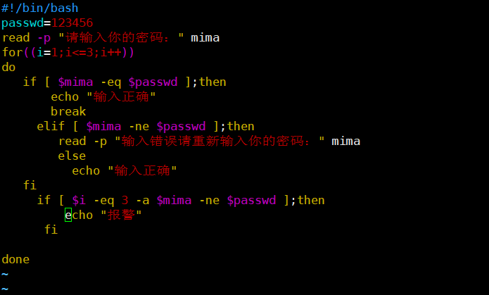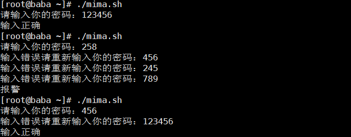 3、用户输入密码,脚本判断密码是否正确,输入正确提示正确信息,连续输错3次则报警