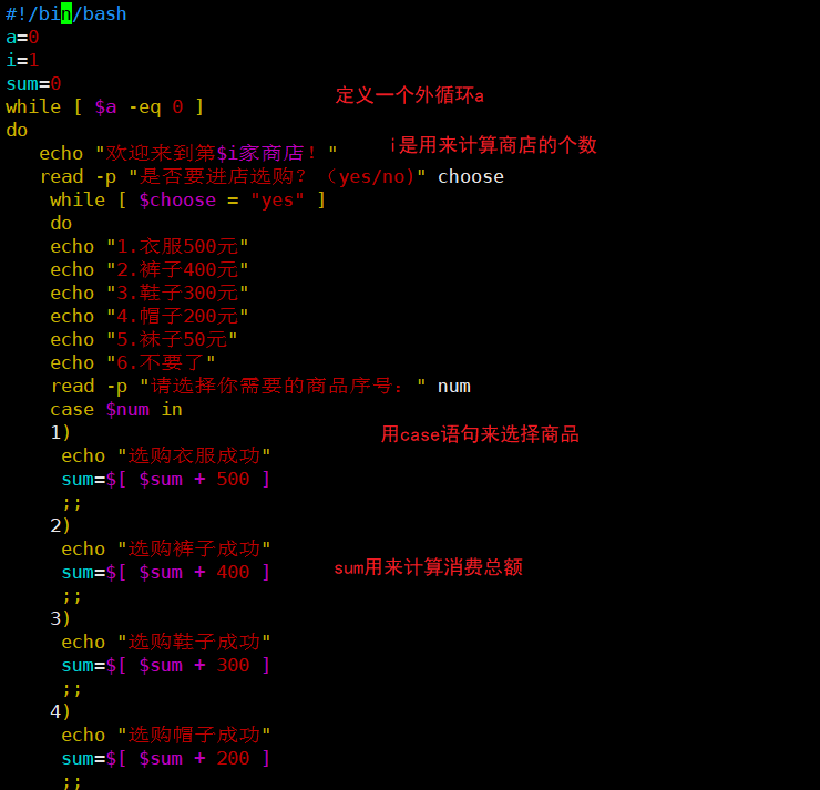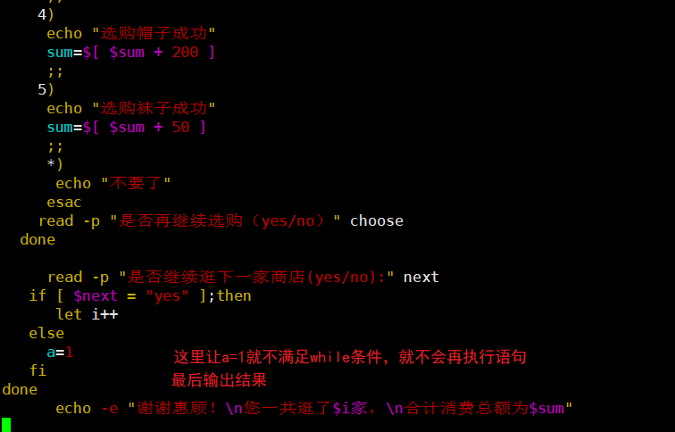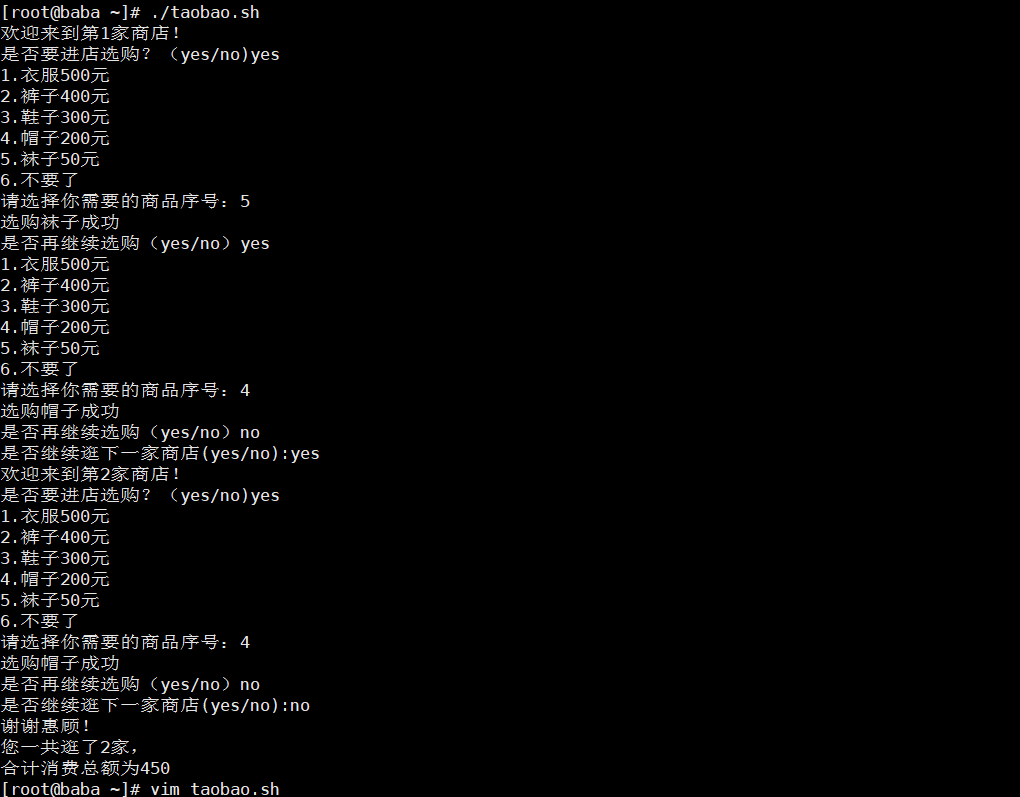 5、写个逛淘宝选购商品脚本,每家商店有五种商品选购(衣服500元,裤子400元,鞋子300元,帽子200元,袜子50元),每次选购完或不买都会提示用户是否继续逛下一家商店,如果不再继续逛的话进行购物车结算总额。