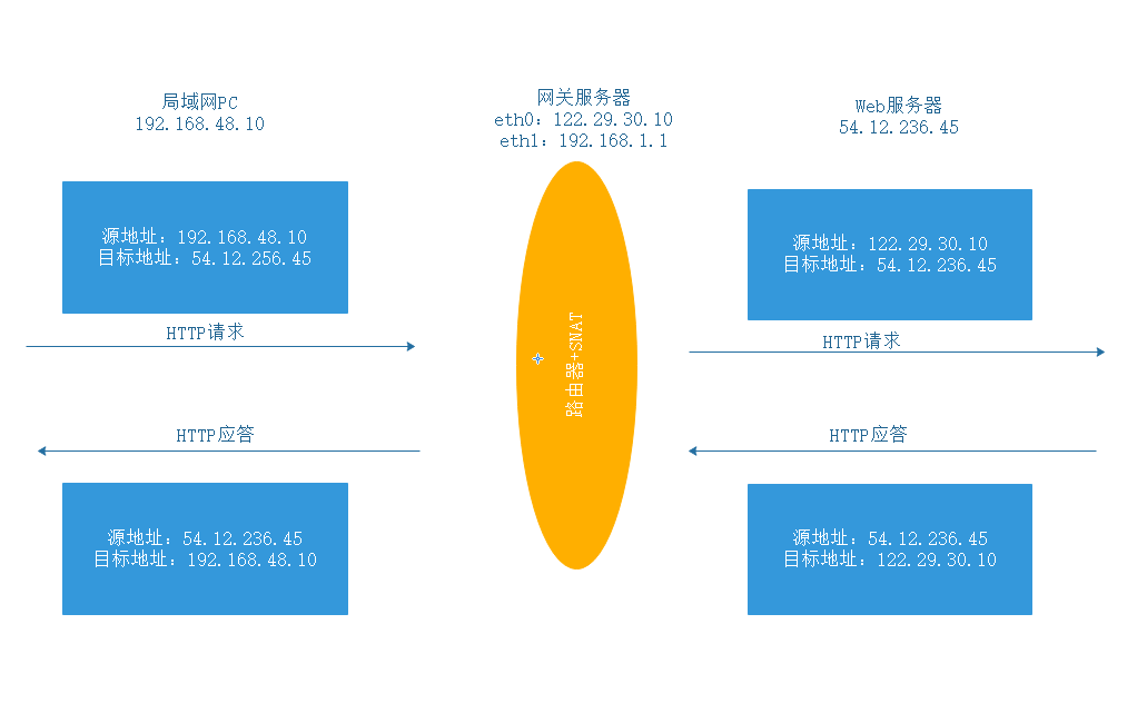 SNAT是Linux防火墙的一种地址转换操作,也是iptables 命令中的一种数据包控制类型,其作用是根据指定条件修改数据包的源IP地址。