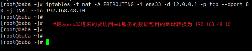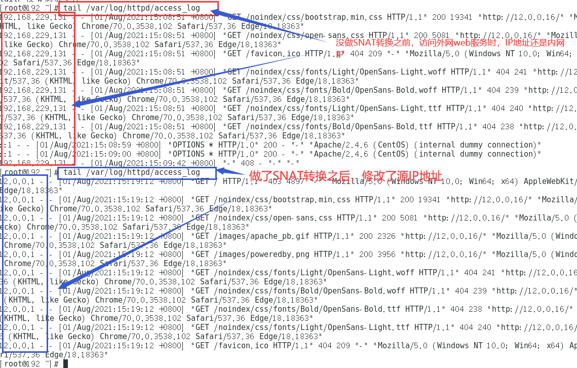 4、查看外网web服务器的日志文件tail /var/log/httpd/access_log,查看访问网址是否修改为12.0.0.1,即SNAT转换是否成功
