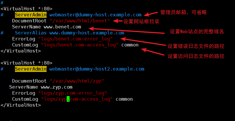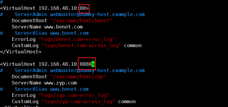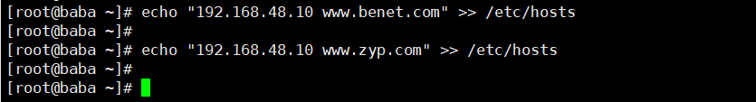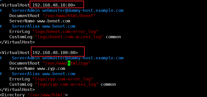 - 基于域名:为每个虚拟主机使用不同的域名,但是其对应的IP地址是相同的。例如:www.benet.com 和www.zyp.com 站点的Ip地址都是192.168.48.10 。这是使用最为普通的虚拟Web主机类型