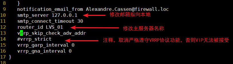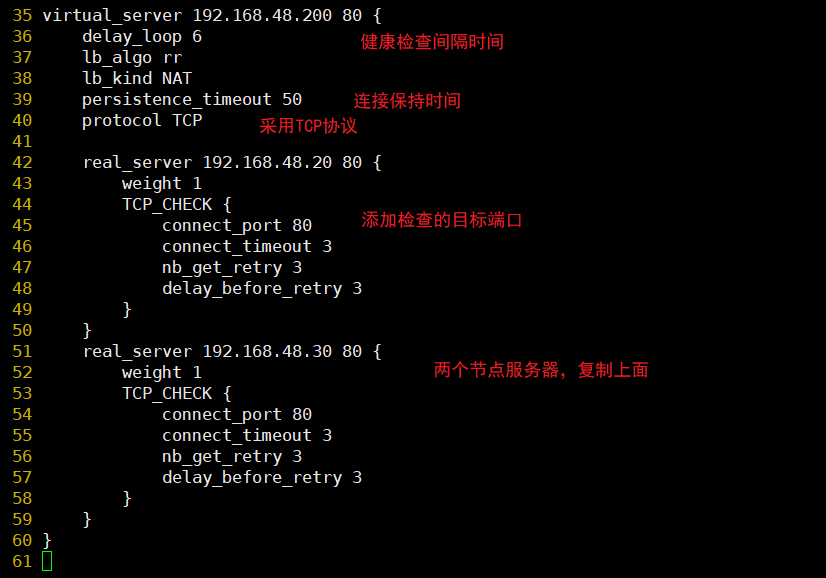 判断LVS负载调度器、节点服务器的可用性,当master主机出现故障及时切换到backup节点保证业务正常,当master故障主机恢复后将其重新加入集群并且业务重新切换回master节点