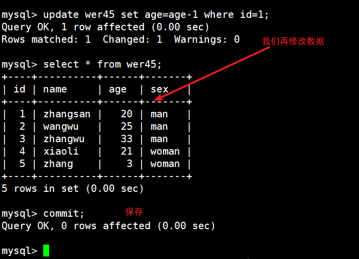 - commit或commit work:提交事务,并使己对数据库进行的所有修改变为永久性的