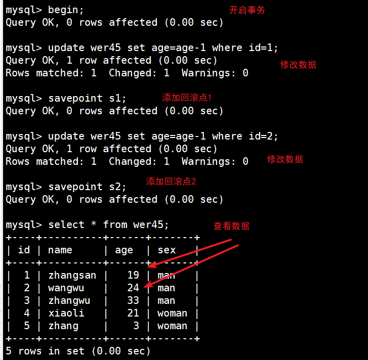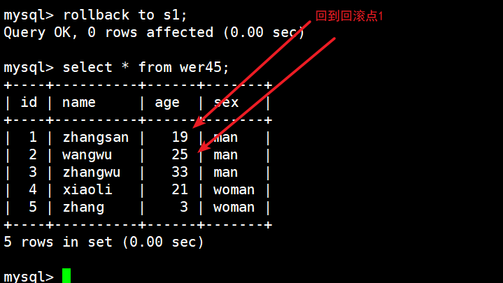 - savepoint s1:使用savepoint 允许在事务中创建一个回滚点,一个事务中可以有多个savepoint:“s1”代表回滚点名称
