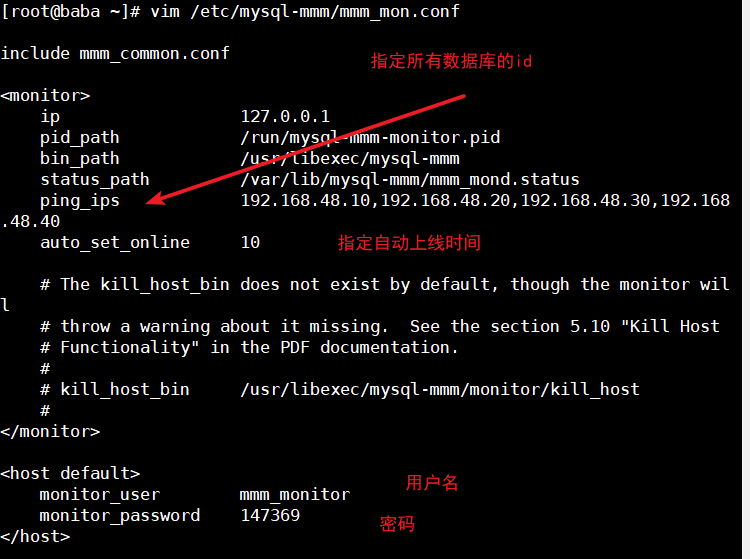 在 monitor 监控服务器上修改监控配置文件 mmm_mon.conf