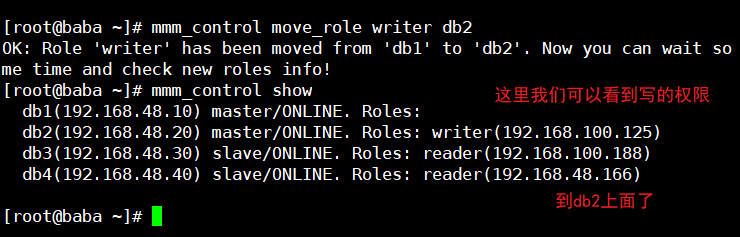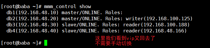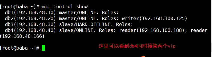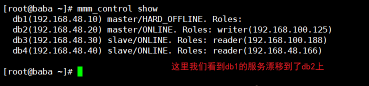 - mysql-mmm的监管端会提供多个虚拟IP(VIP),包括一个可写VIP,多个可读VIP,通过监管的管理,这些IP会绑定在可用MySQL之上,当某一台MySQL宕机时,监管会将VIP迁移至其他MySQL