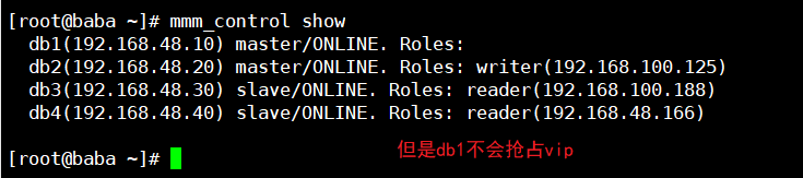 - mmm-mon:监控进行,负责所有的监控工作,决定和处理所有节点角色活动。此脚本需要再监管上运行
