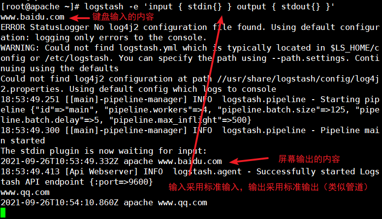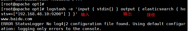 | -e | 从命令中获取,输入、输出后面跟着字符串,该字符串可以被当作Logstash的配置(如果是空,则默认使用stdin作为输入,stdout作为输出) |