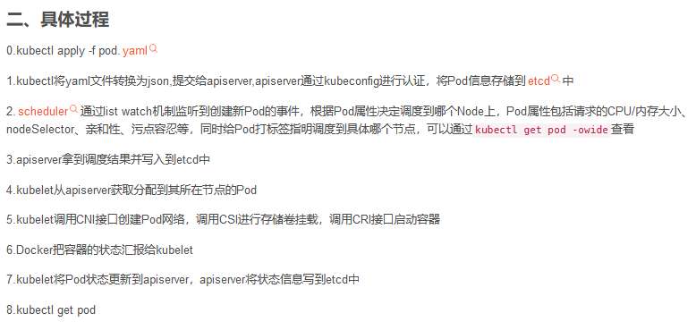 用户通过kubectl创建pod的相关信息发送给Kube-apiserver,Kube-apiserver回先把信息写入到etcd中,这个时候etcd会发送个create事件给Kube-apiserver,Kube-apiserver接收到create事件后发送给kube-controller-manager,kube-controller-manager接收到create事件后,会调用它里面的控制器(rc,rs);kube-controller-manager把pod的副本创建好之后发送给Kube-apiserver,Kube-apiserver会把详细的信息写入到etcd,etcd写好后会把创建pod的事件发送给Kube-apiserver,接下来Kube-apiserver会发送给kube-scheduler(scheduler一直监听着Kube-apiserver);kube-scheduler根据一系列的调度算法找到pod需要到哪个node节点上,最后kube-scheduler把最后的结果发送给Kube-apiserver,Kube-apiserver把这些更新的信息发送到etcd中;etcd存储完成后,发送给Kube-apiserver,Kube-apiserver会把调度的结果反馈给相应node节点上的kubelet(kubelet也在无时无刻监听着Kube-apiserver)。