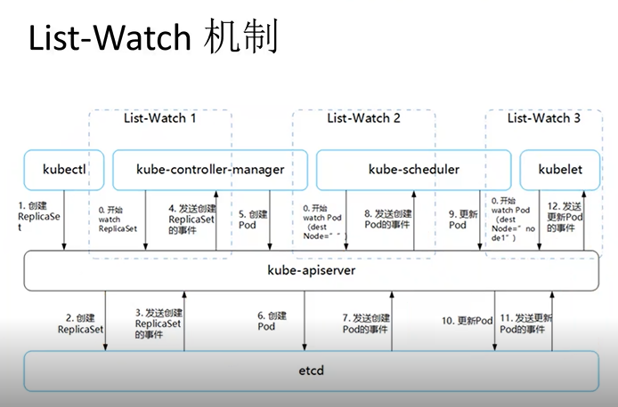 - 这里有三个 List-Watch,分别是 Controller Manager(运行在 Master),Scheduler(运行在 Master),kubelet(运行在 Node)。他们在进程已启动就会监听(Watch)APIServer 发出来的事件。