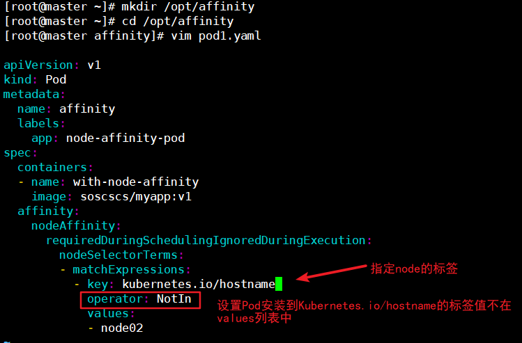 | nodeAffinity | 主机 | In, NotIn, Exists,DoesNotExist, Gt, Lt | 否 | 指定主机 |