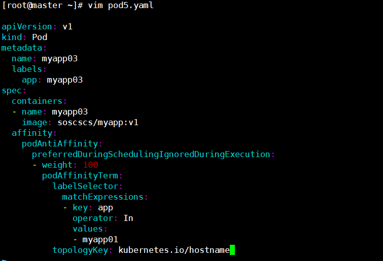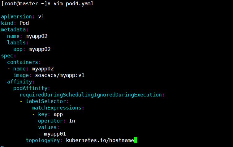 #如果节点处于 Pod 所在的同一拓扑域且具有键“app”和值“myapp01”的标签, 则该 pod 不应将其调度到该节点上。 (如果 topologyKey 为 kubernetes.io/hostname,则意味着当节点和具有键 “app”和值“myapp01”的 Pod 处于相同的区域,Pod 不能被调度到该节点上。)