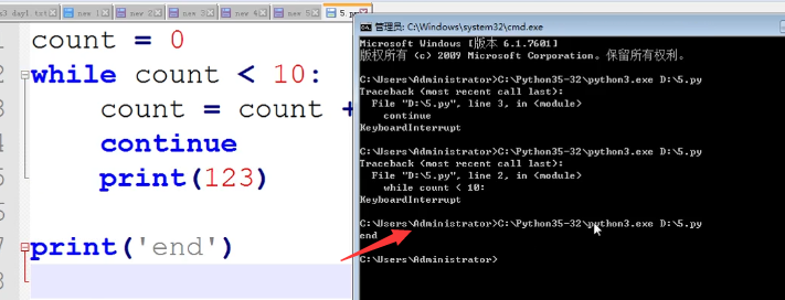 1 while True 2 number=int(input(“请输入数字: ”)) 3 if number == 7 : 4 continue 5 elif number > 10 : 6 exit() 7 print(number)