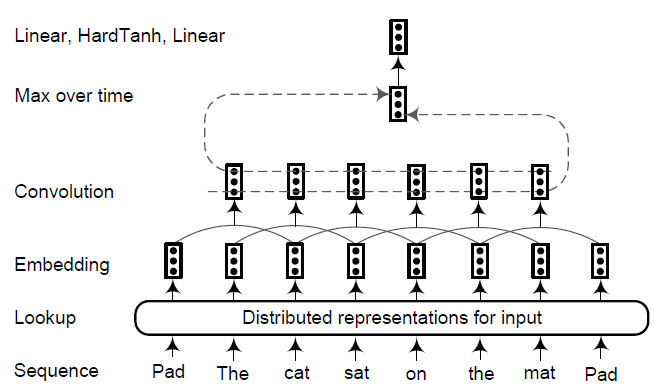 Collobert et al.提出了一种基于句子的网络模型,其先将句子中的每个单词嵌入一个n维向量,然后卷积层对单词产生局部特征,将局部特征向量组合起来构成全局特征向量,之后对句子中的位置进行最大池化或者平均池化后送入全连接层,最后将全连接层产生的特征向量送入标签解码器,其具体结构如图所示。